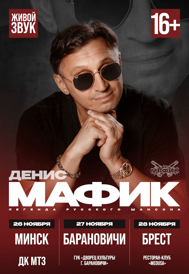Два десятилетия непревзойденного шансона. Более 20 альбомов, сотни песен и миллионы благодарных сердец. В этом году легенда русского шансона Денис МАФИК празднует грандиозный творческий юбилей и привозит свой долгожданный сольный концерт в Беларусь!