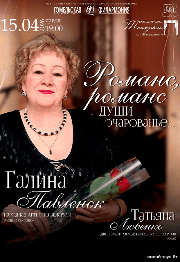 Есть жанры, которые никогда не стареют. Романс — это разговор сердца с сердцем, это поэзия, положенная на музыку. Концерт «Романс, романс... души очарованье» подарит ценителям искусства Народная артистка Республики Беларусь Галина Павленок в сопровождении дипломанта международных конкурсов Татьяны Любенко. Вечер откроет проникновенная вокальная лирика. В концертной программе прозвучат такие произведения, как П. Чайковский «Средь шумного бала», В. Баснер «Белой акации грозди душистые» И. Лученок «Я не могу про Вас забыцца». Гости также услышат, как поэтическая глубина избранных мелодий сплетётся с бархатным тембром меццо-сопрано Галины Павленок, а эмоциональные волны рояля в исполнении Татьяны Любенко сменятся изысканным диалогом голоса и инструмента, главную партию в котором ведёт заслуженная артистка. Знаковые сочинения классического репертуара прозвучат в исполнении мастеров, раскрывая внутренний мир человеческих чувств.