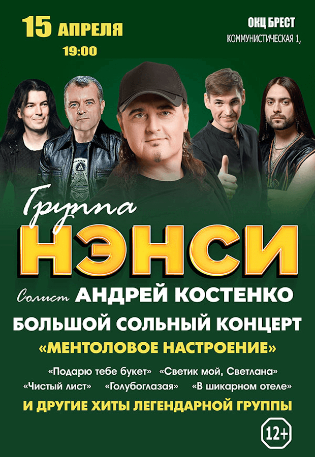 На концерте группы «НЭНСИ» вы получите незабываемые впечатления и окунетесь в атмосферу романтики 90-х. Вас ждут любимые хиты и новые душевные композиции в живом исполнении фронтмена Андрея Костенко с музыкальным коллективом!