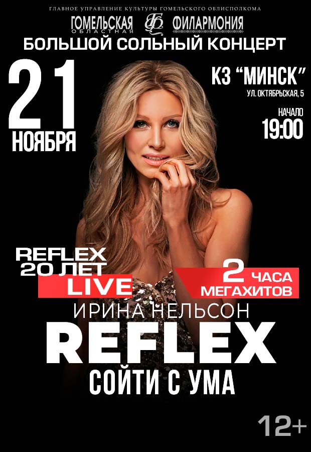 Хиты «Сойти с ума», Non Stop, «Люблю», «Танцы», «Потому что не было тебя», «Первый раз» и многие другие знают и поют миллионы. Стильная, яркая и всегда современная группа REFLEX во главе с Ириной Нельсон продолжает создавать новые песни и собирать аншлаги на больших сольных концертах.