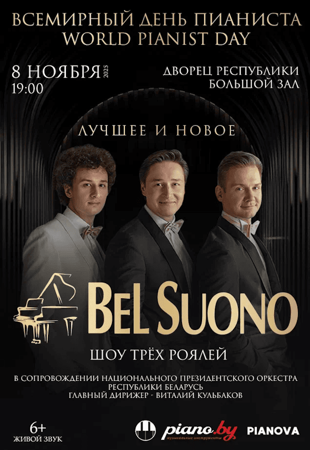 8 ноября 2025 года грандиозное шоу трех роялей BEL SUONO представит программу «ЛУЧШЕЕ и НОВОЕ» на сцене Большого зала Дворца Республики в сопровождении Заслуженного коллектива Республики Беларусь «Национального Президентского оркестра Республики Беларусь» под управлением главного дирижера Виталия Кульбакова, зрителей ждет незабываемый вечер.
