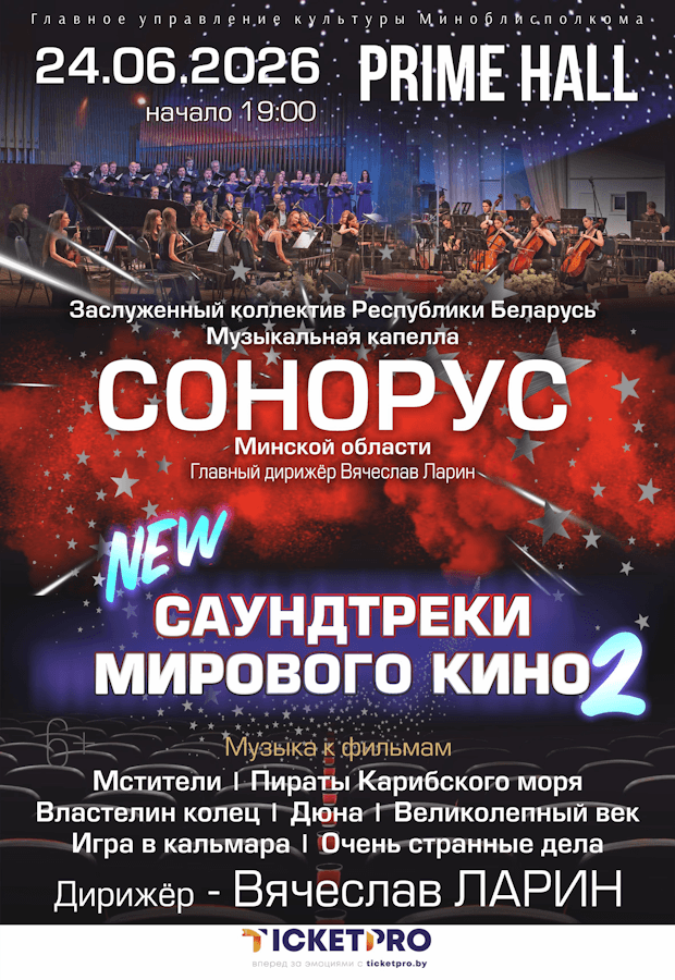 С радостью приглашаем вас на незабываемый вечер музыки и эмоций! Заслуженный коллектив Республики Беларусь "Музыкальная капелла "Сонорус" Минской области, под руководством главного дирижёра Вячеслава Ларина представляет новую, захватывающую программу "Саундтреки мирового кино- 2".