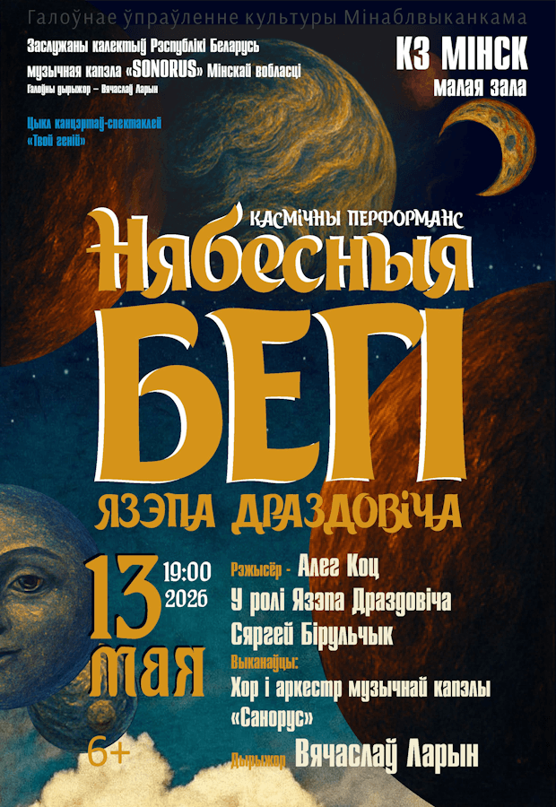 Космический перформанс «Нябесныя бегi Язэпа Драздовiча» — третья постановка цикла концертов-спектаклей «Твой гений», посвящённая одному из самых загадочных и вдохновляющих белорусских художников — Язепу Дроздовичу.