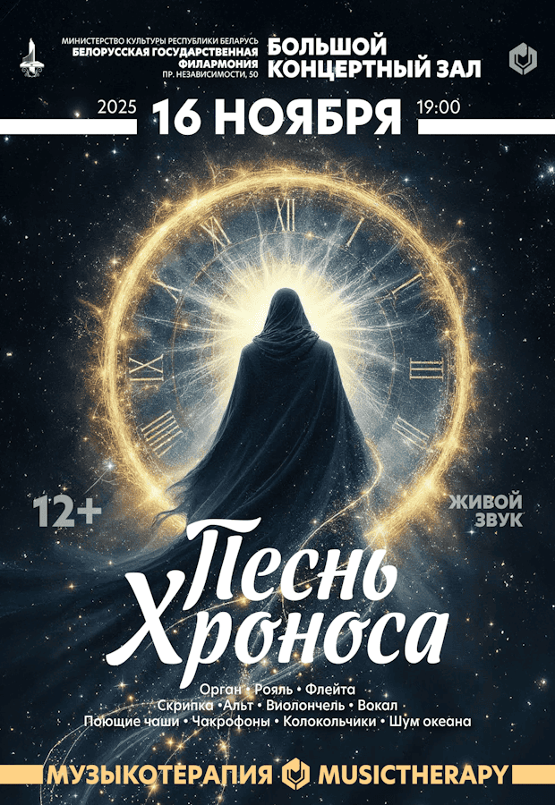 Приглашаем вас 23 ноября в Большой зал Белгосфилармонии. Вы услышите программу «Музыкотерапия. Песнь Хроноса» – новую авторскую разработку Международного Центра Музыкотерапии. Это не просто концерт, а мультисенсорное переживание, в котором классическая музыка, звуки природы, терапевтические инструменты, световые образы и видеопроекции сливаются в единое медитативное пространство.