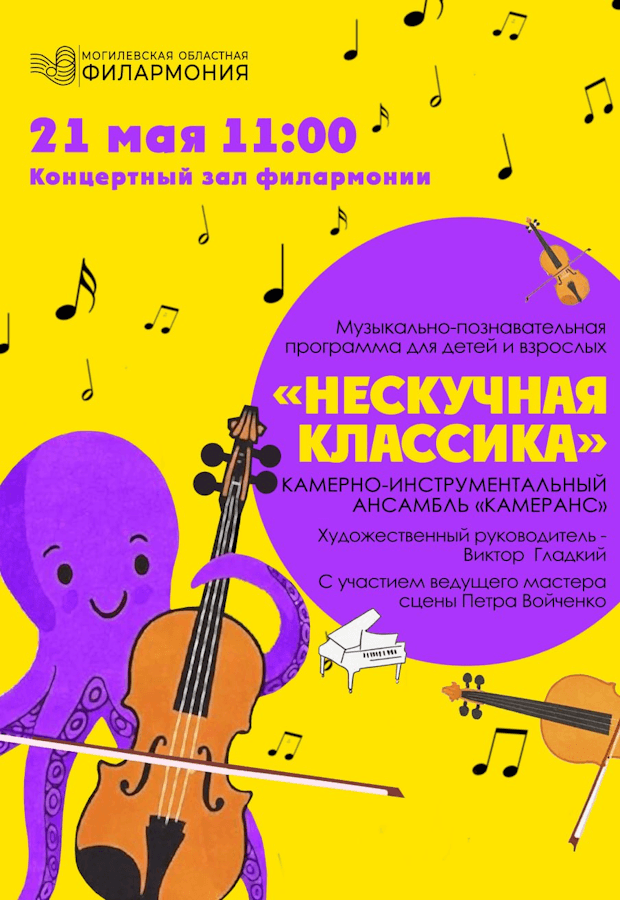 21 мая в 11.00 в концертном зале филармонии пройдет музыкально-познавательная программа «Нескучная классика» камерно-инструментального ансамбля «Камеранс». Вас ждет увлекательное знакомство с шедеврами классической музыки, композиторами и инструментами.