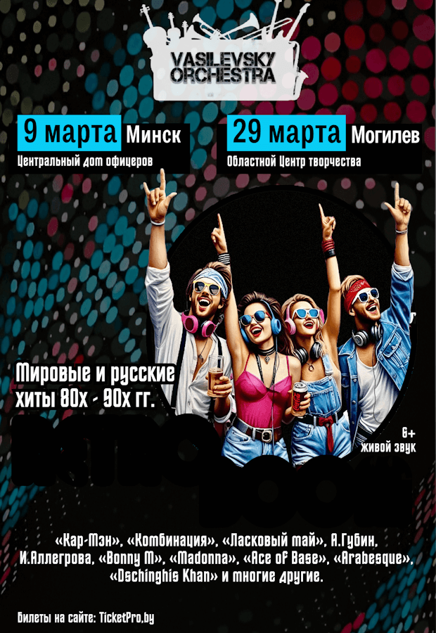 «Кар-Мэн», «Комбинация», «Ласковый май», А.Губин, И.Аллегрова, «Bonny M», «Madonna», «Ace of Base», «Arabesque», «Dschinghis Khan» и многие другие – в исполнении эстрадно-симфонического оркестра!