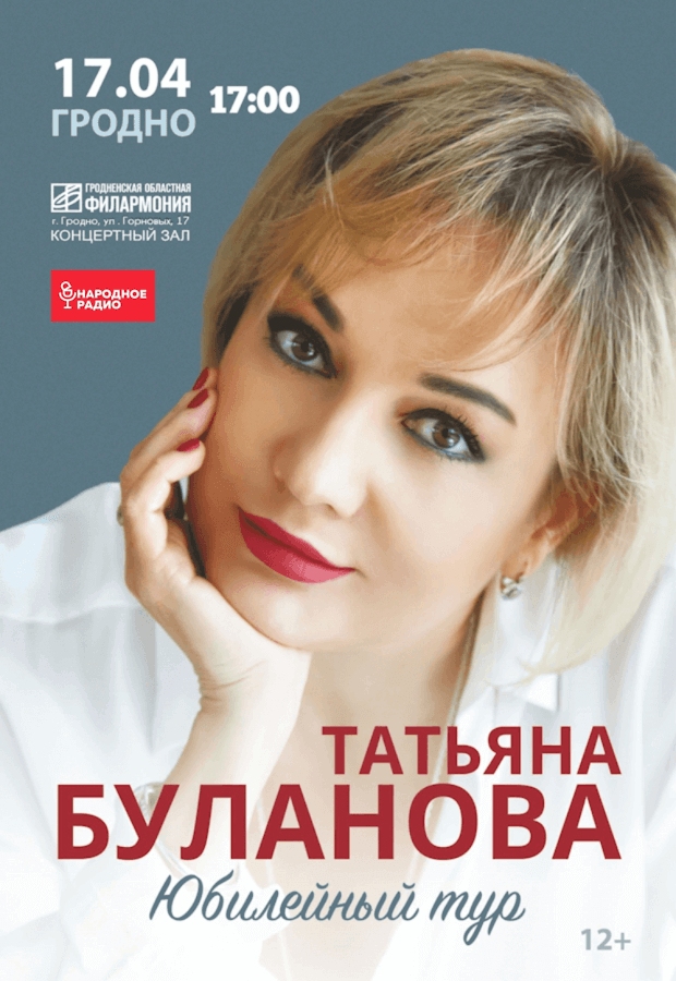 Этой весной Татьяна Буланова отпразднует свой день рождения концертами в городах Беларуси – нас ждет новое шоу с главными хитами: среди них «Не плачь», «Ясный мой свет», «Мой ненаглядный» – и многие другие.