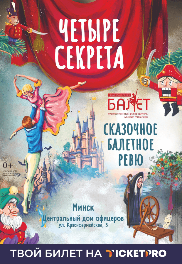 Фрагменты классических балетов «Спящая красавица», «Белоснежка и семь гномов», «Золушка» и «Щелкунчик», объединённые в один сюжет. Ревю (франц. revue) – эстрадное или театральное представление из отдельных сцен, номеров, объединённых между собой общей темой. Как быть, если хочется стать настоящей принцессой? Что делать, если мечты никак не сбываются? Самый лучший выход в этой непростой ситуации – спросить совета у бабушки! Бабушка все знает и умеет, она сама когда-то была и Белоснежкой, и Золушкой, и даже Спящей красавицей! Она хранит невероятное количество секретов и некоторые из них обязательно расскажет своей любимой внучке! «Четыре секрета» - прекрасное погружение в мир балета и сказки!