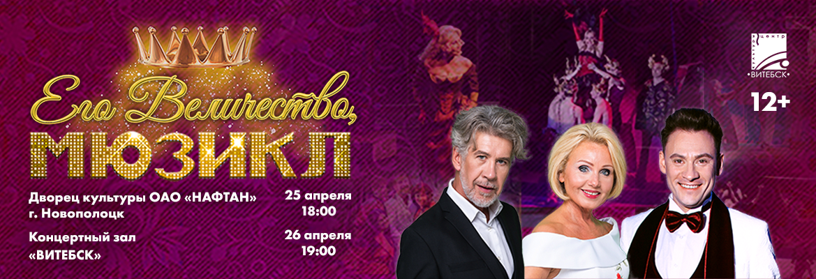 25 апреля во Дворце культуры города Новополоцка «Нафтан» и 26 апреля в Концертном зале «Витебск» состоится концертная программа «Его Величество, мюзикл». На сцене выступят заслуженные артисты России — лауреаты престижных театральных премий, включая «Золотую маску» и «Музыкальное сердце театра».