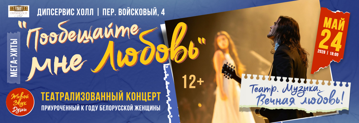 24 мая в Dipservice Hall состоится театрализованный концерт «Пообещайте мне любовь», приуроченный к Году белорусской женщины. Это музыкально-поэтический вечер, посвящённый женщине, её силе, искренности, любви и внутреннему миру.