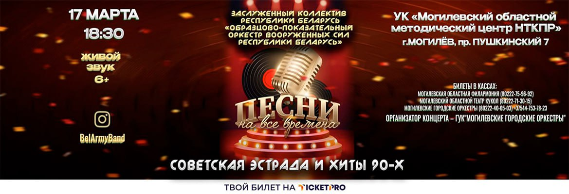17 марта в УК «Могилёвский областной методический центр народного творчества и культурно-просветительной работы» состоится концерт Заслуженного коллектива Республики Беларусь — Образцово-показательного оркестра Вооружённых Сил Республики Беларусь. Программа «Песни на все времена» объединит лучшие образцы советской эстрады и популярные хиты 90-х годов.