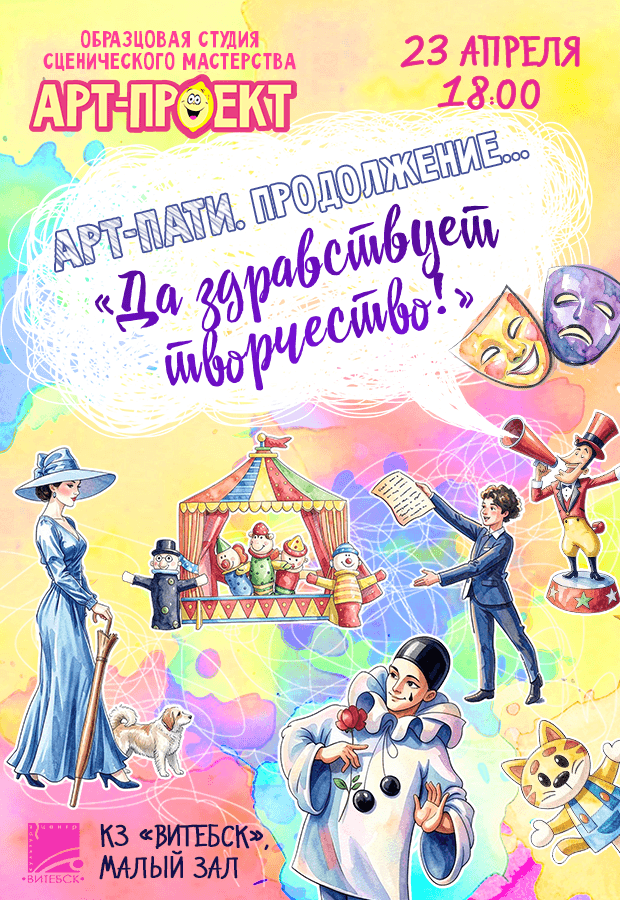 23 апреля в 18:00 в малом зале концертного зала «ВИТЕБСК» состоится творческий вечер образцовой студии сценического мастерства «АРТ-ПРОЕКТ». Приглашаются родители, друзья и гости на мероприятие «АРТ-ПАТИ. ПРОДОЛЖЕНИЕ...». Девиз вечера: «Да здравствует творчество!»