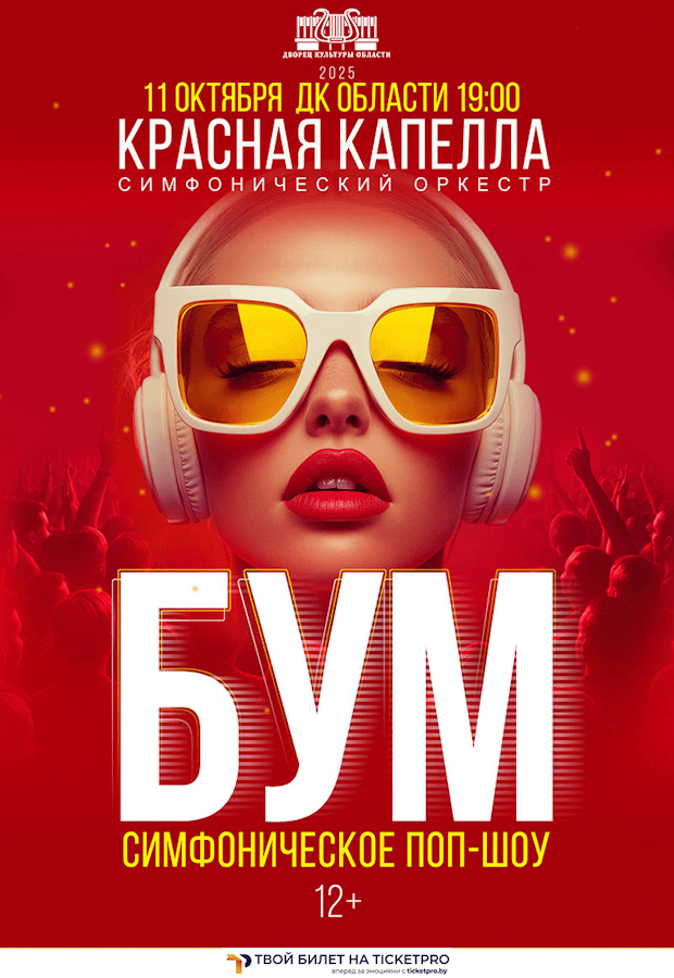 БУМ — это новая программа симфонического оркестра КРАСНАЯ КАПЕЛЛА и это не просто концерт, а настоящее симфоническое поп-шоу, которое переосмысливает культовые танцевальные гимны последних 30 лет. Это волна ностальгии для тех, кто вырос на популярной музыке 90-х и 2000-х, а также для любителей электронной музыки. Это однозначно новый симфонический формат на рынке концертов Беларуси!