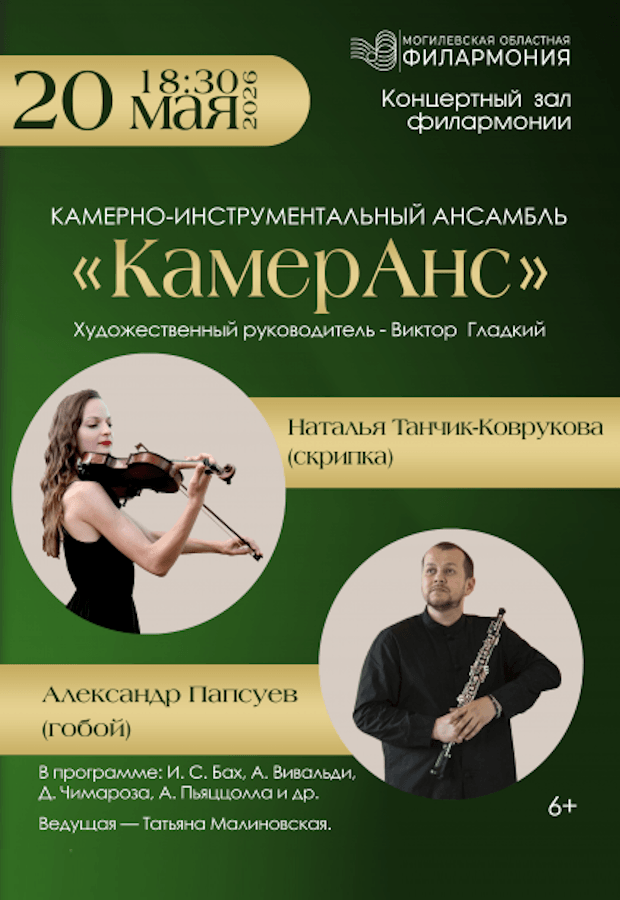 20 мая в 18:30 в концертном зале филармонии пройдет концертная программа камерно-инструментального ансамбля «КамерАнс» (художественный руководитель - Виктор Гладкий).
