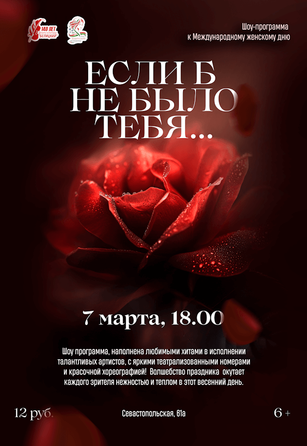 Мы поздравляем всех милых женщин и пусть ваши желания исполняются, близкие люди окружают вас теплом, заботой и вниманием! А мы дарим вам незабываемую шоу-программу, насыщенную яркими творческими номерами, в которых примут участие лучшие артисты города Гомеля.