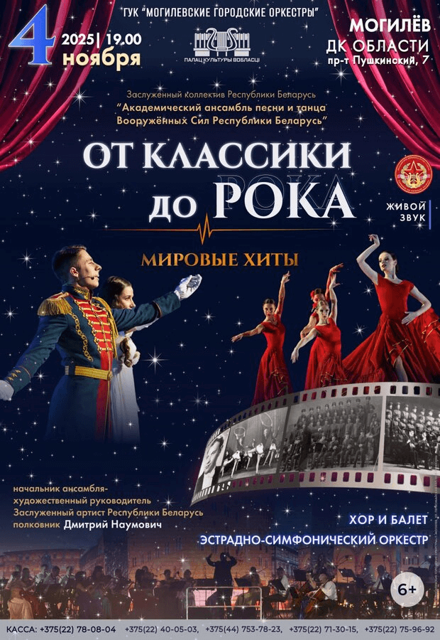 4 ноября 2025 года в 19.00 состоится концерт Академического ансамбля песни и танца Вооружённых Сил Республики Беларусь под управлением Заслуженного артиста РБ полковника Дмитрия Наумовича с программой "От классики до рока. Мировые хиты".