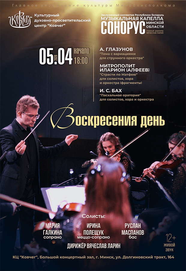 5 апреля в центре «Ковчег» Заслуженный коллектив Республики Беларусь “Сонорус” и дирижер Вячеслав Ларин ждут слушателей с программой «Воскресения день». В этот вечер для вас также будут петь солисты Большого театра Беларуси. Светоносное, прозрачное сопрано Марии Галкиной. Благородное, глубокое меццо-сопрано Ирины Полещук. И мощный бас Руслана Маспанова.