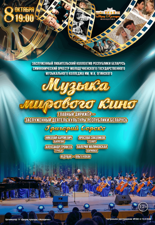 Концертная программа «Музыка мирового кино» в исполнении заслуженного любительского коллектива Республики Беларусь симфонического оркестра Молодечненского государственного музыкального колледжа им. М.К. Огинского под управлением заслуженного деятеля искусств Республики Беларусь Григория Сороко – это увлекательное путешествие по самым известным и любимым киномелодиям разных эпох и стран.