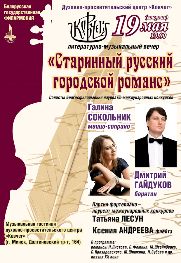 В литературно-музыкальной программе солистов Белорусской государственной филармонии, лауреатов международных конкурсов Галины СОКОЛЬНИК и Дмитрия ГАЙДУКОВА прозвучат мечтательные, драматические, игривые, чувственные романсы композиторов: Н. Листова, Б. Фомина, М. Штейнберга, Б. Прозаровского, М. Шишкина, Н. Зубова, и других.