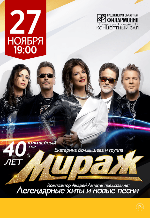 Легендарная советская и российская музыкальная группа «Мираж», с юбилейной программой «Музыка нас связала. Все лучшее за 40 лет».