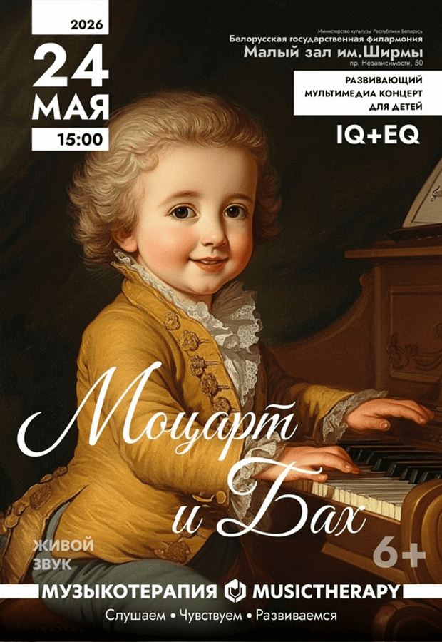 Приглашаем вас на невероятный детский концерт «МУЗЫКОТЕРАПИЯ. МОЦАРТ И БАХ», где вы познакомитесь с двумя величайшими композиторами мира, чья музыка полна радости, света и величия!