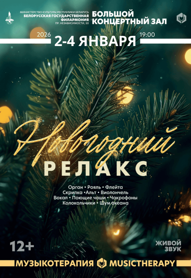 Приглашаем Вас в Большой зал Белгосфилармонии на новую программу «Музыкотерапия. Новогодний релакс» - уникальную авторскую разработку международного центра музыкотерапии.