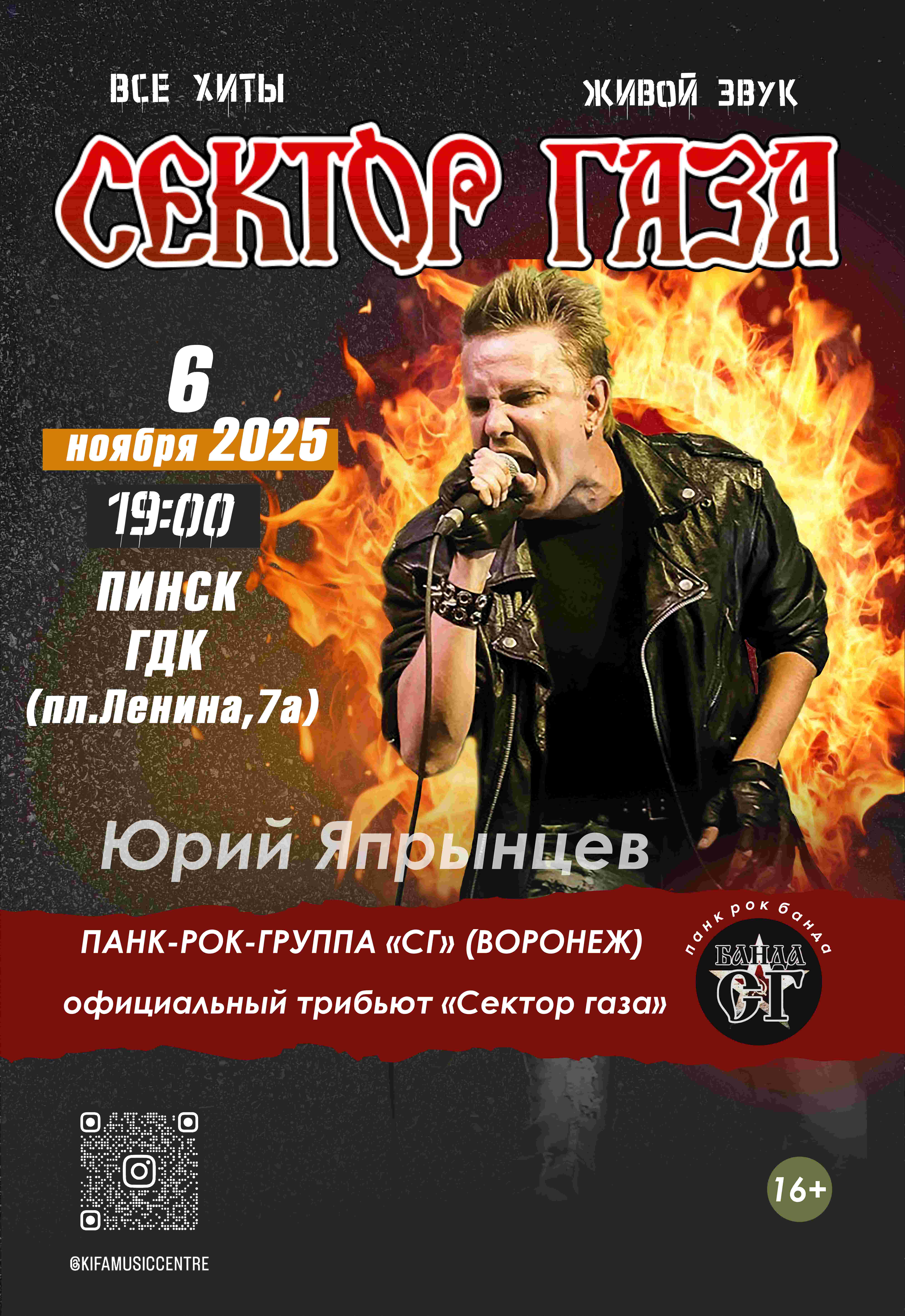 Воронежская панк-группа «СГ» с солистом Юрием Япрынцевым (племянник Юрия Клинских «Хоя») готова подарить вам потрясающую энергию бессмертных хитов легендарного «Сектора Газа».