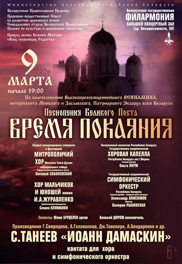 Возврат билетов производится в кассе Белгосфилармонии по адресу: г. Минск, пр. Независимости, 50. Телефон кассы: 8 (017) 396 16 17. Возврат билетов осуществляется до 7 марта 2026 включительно по графику работы кассы: Пн - Вс с 10-00 до 20- 00 (обед с 14-00 до 15-00). Возврат производится в размере не менее 75 (семидесяти пяти) процентов от стоимости билета. Сервисный сбор билетного оператора не возвращается, т.к. услуга по продаже билетов считается оказанной.