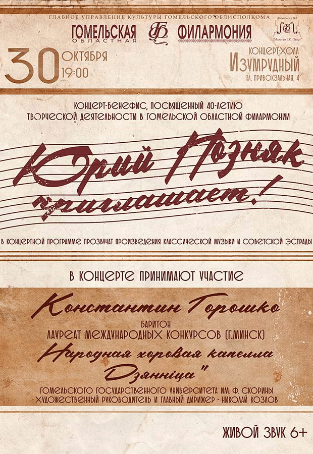 30 октября солист Гомельской областной филармонии Юрий Позняк приглашает на концерт-бенефис, посвящённый 40-летию его творческой деятельности.