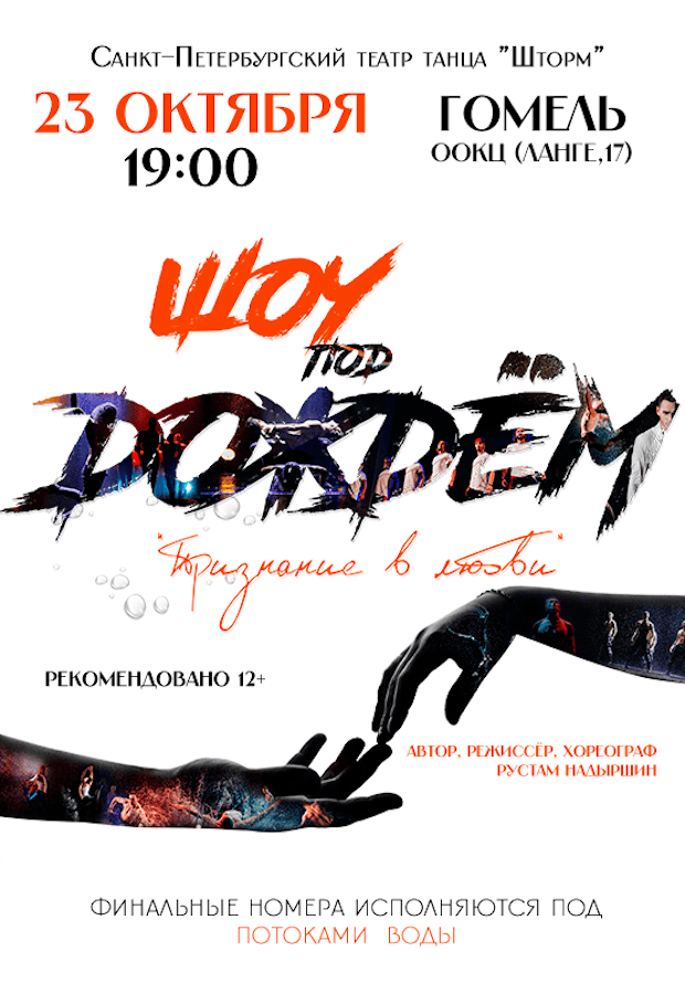 «Шоу под дождём» — это вихрь эмоций, энергия и сила танца, которые захватывают зрителя с первых минут. А в финале на сцене разольются потоки воды, создавая незабываемое зрелище!