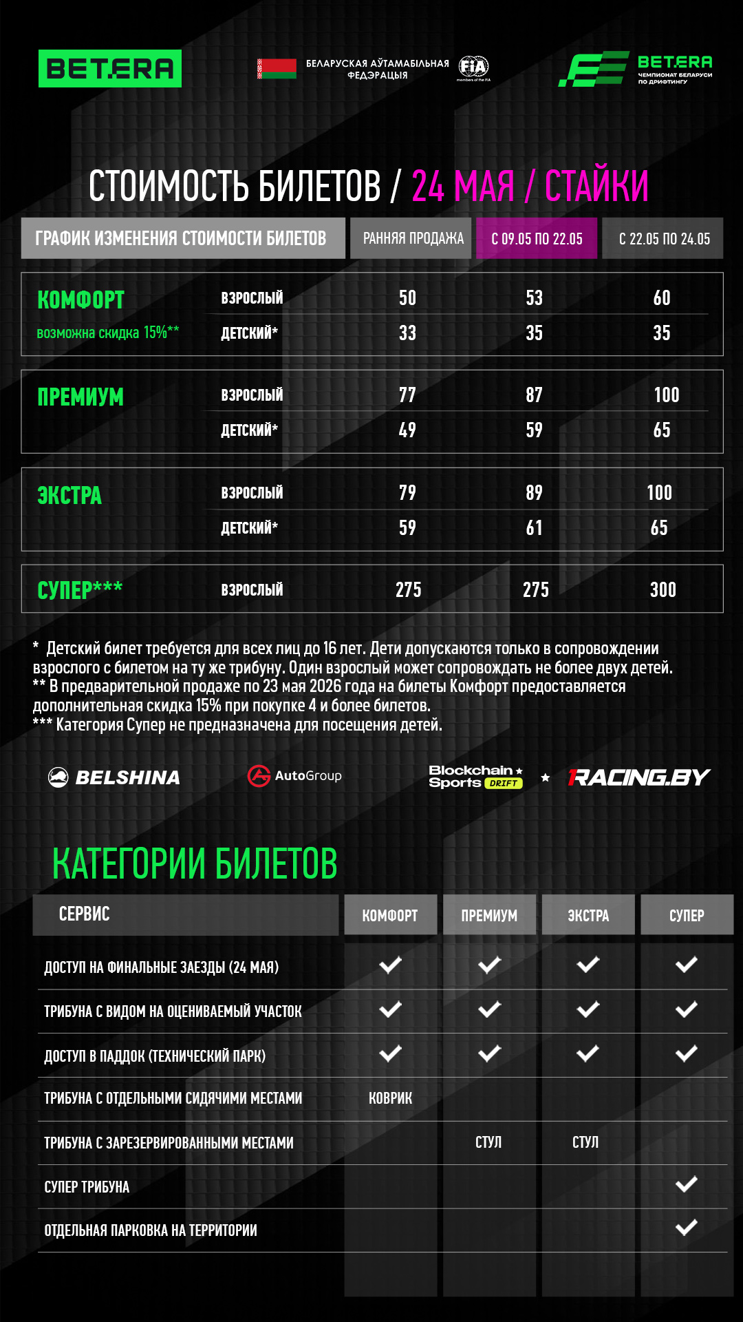 Все гости получают доступ в Паддок. Для детей до 16 лет требуется детский билет и сопровождающий взрослый с соответствующим типом билета. Для покупки детского билета необходимо в корзине Тикетпро выбрать опцию "Скидка"->"Детский".