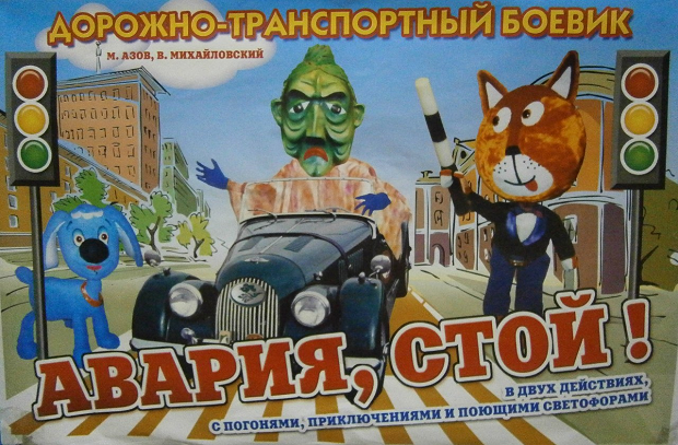 Дорожно-транспортный боевик в 2-х действиях, с погонями, приключениями, поющими светофорами, знаками, пешеходами и дирижёром транспортного движения. Учит детей правилам безопасного дорожного движения.