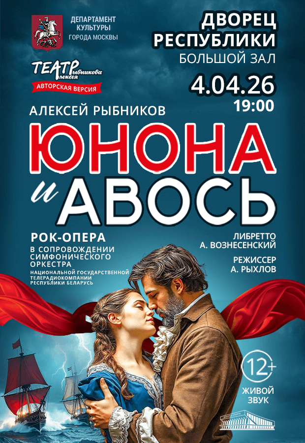 Выдающийся русский композитор Алексей Рыбников и поэт Андрей Вознесенский создали произведение, ставшее самой известной рок-оперой на российской сцене. Впервые 4 апреля в Минске, во Дворце Республики, Московская государственная творческая мастерская под руководством Народного артиста РФ, Лауреата Государственной премии РФ, композитора Алексея Львовича Рыбникова представит полную авторскую версию «Юноны и Авось» в грандиозном сопровождении Симфонического оркестра Белтелерадиокомпании!