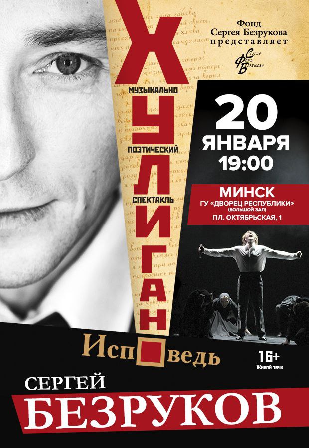 В музыкально-поэтическом спектакле «Хулиган. Исповедь» песни на стихи Есенина и сами стихи в исполнении Сергея Безрукова сотканы в историю о судьбе великого русского поэта. За два часа перед нами пронесется вся его жизнь: его мечты и разочарования, метания и душевная боль, любовь, стихи – и трагический финал. Это исповедь Поэта, в которой нет ни единой выдуманной строчки — все слова, звучащие в спектакле, принадлежат самому Есенину.