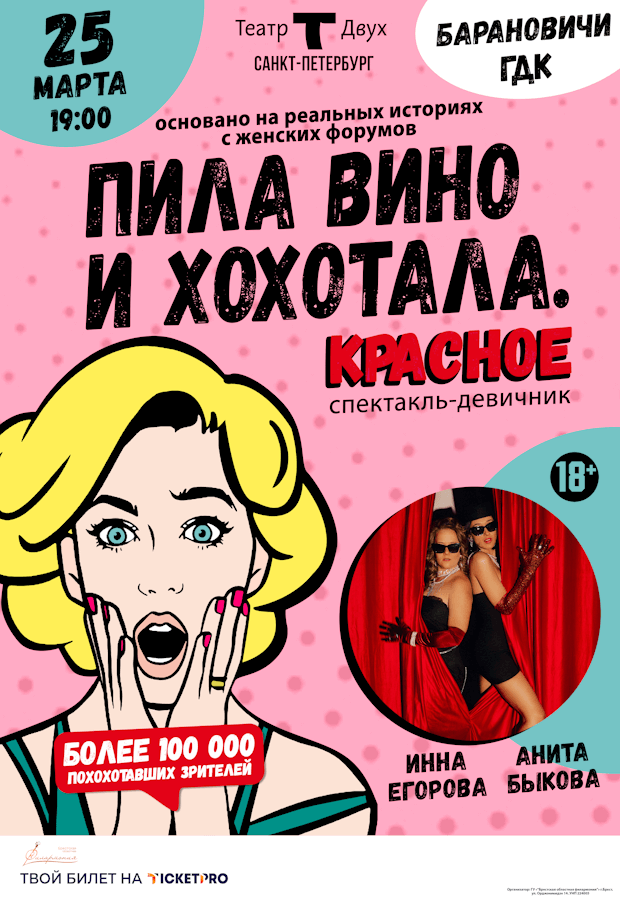 Стендап-комедия "Пила вино и хохотала. Красное", запланированная к проведению 25.03.2026 ОТМЕНЕНА.