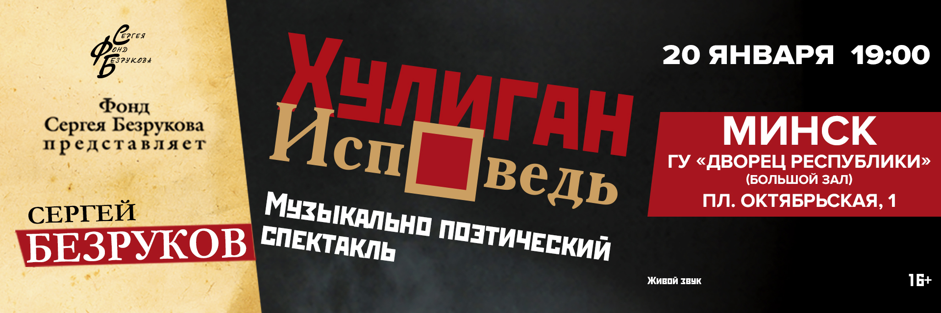 СПЕКТАКЛЬ «ХУЛИГАН. ИСПОВЕДЬ» С СЕРГЕЕМ БЕЗРУКОВЫМ ПОКАЖУТ В МИНСКЕ