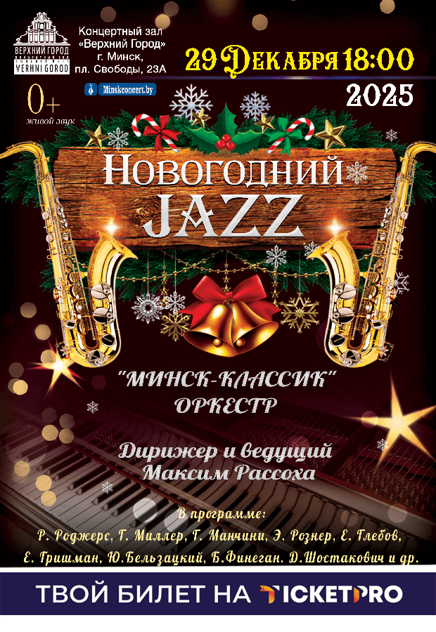 29 декабря в 18.00 в концертном зале «Верхний город» почитатели искрометной музыки окунуться в мир великолепного и неповторимого новогоднего джаза!