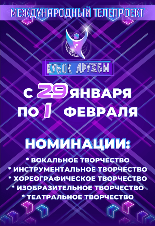 «КУБОК ДРУЖБЫ» — масштабный телепроект, где участники выходят на большую сцену, чтобы показать свои таланты во всей силе. Здесь каждый номер — это история, энергия и характер, а каждое выступление — возможность заявить о себе громко и уверенно.